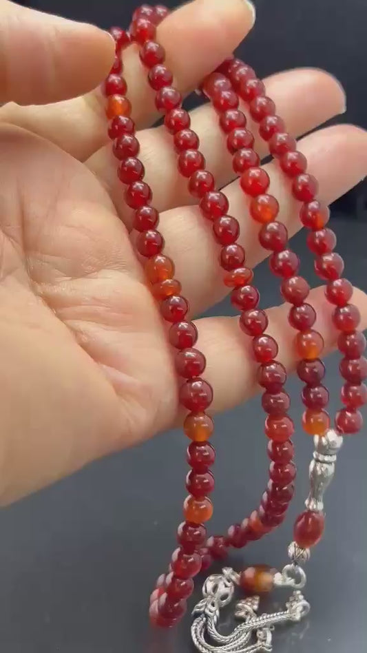 Akik Tasbih 99, natürlicher Achat Edelstein, islamisches tasbeeh, Misbaha, 925er Silbere Quaste