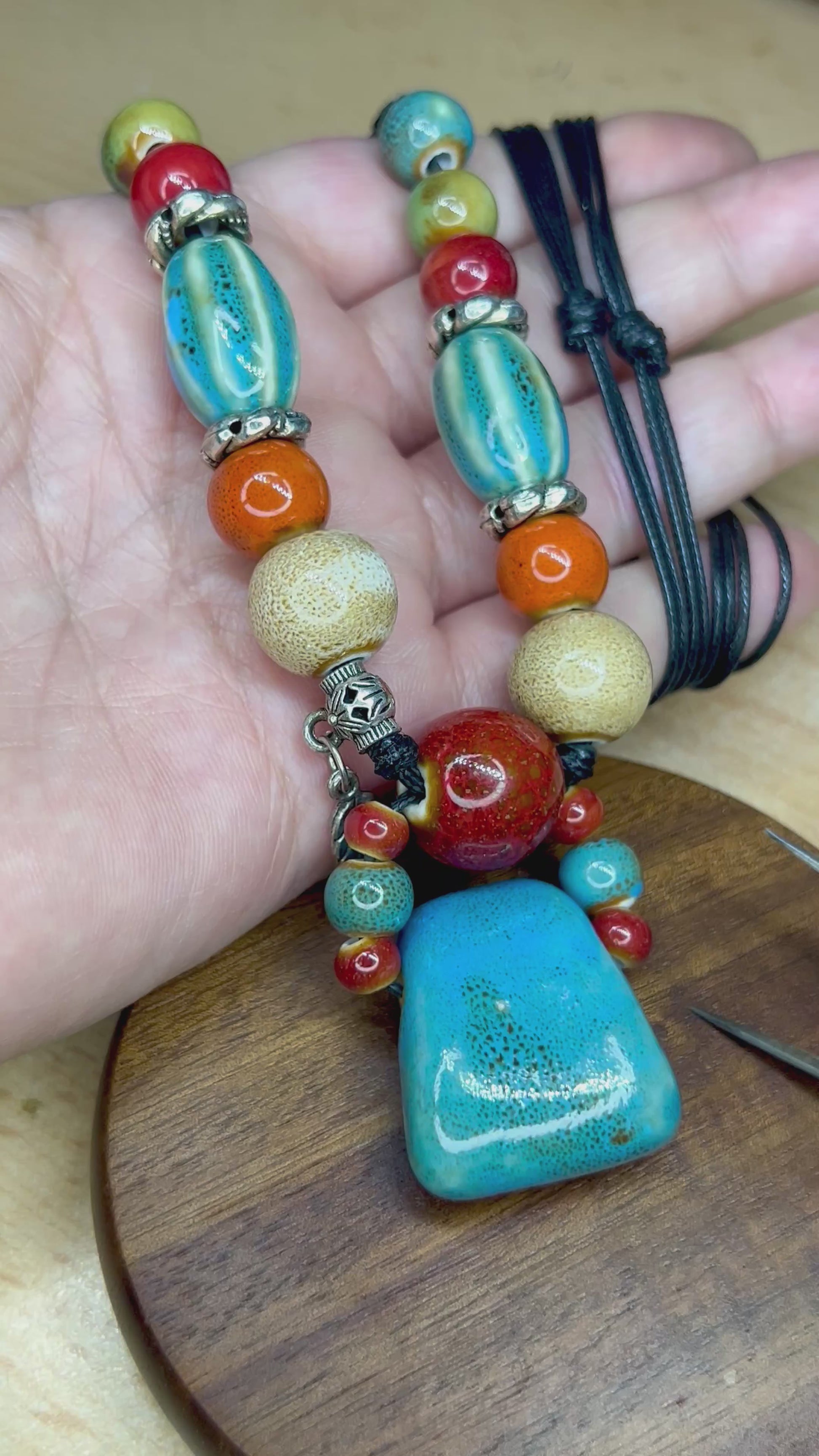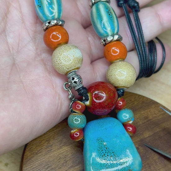Handgemachte Halskette mit Keramikperlen in Erdtönen. Verstellbares Kunstlederband. Einzigartige Texturen.
